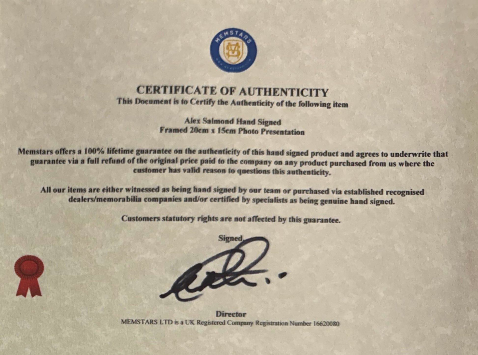 We only sell 100% genuine HAND SIGNED authentic memorabilia with Certificates of Authenticity from us and/or AFTAL members.