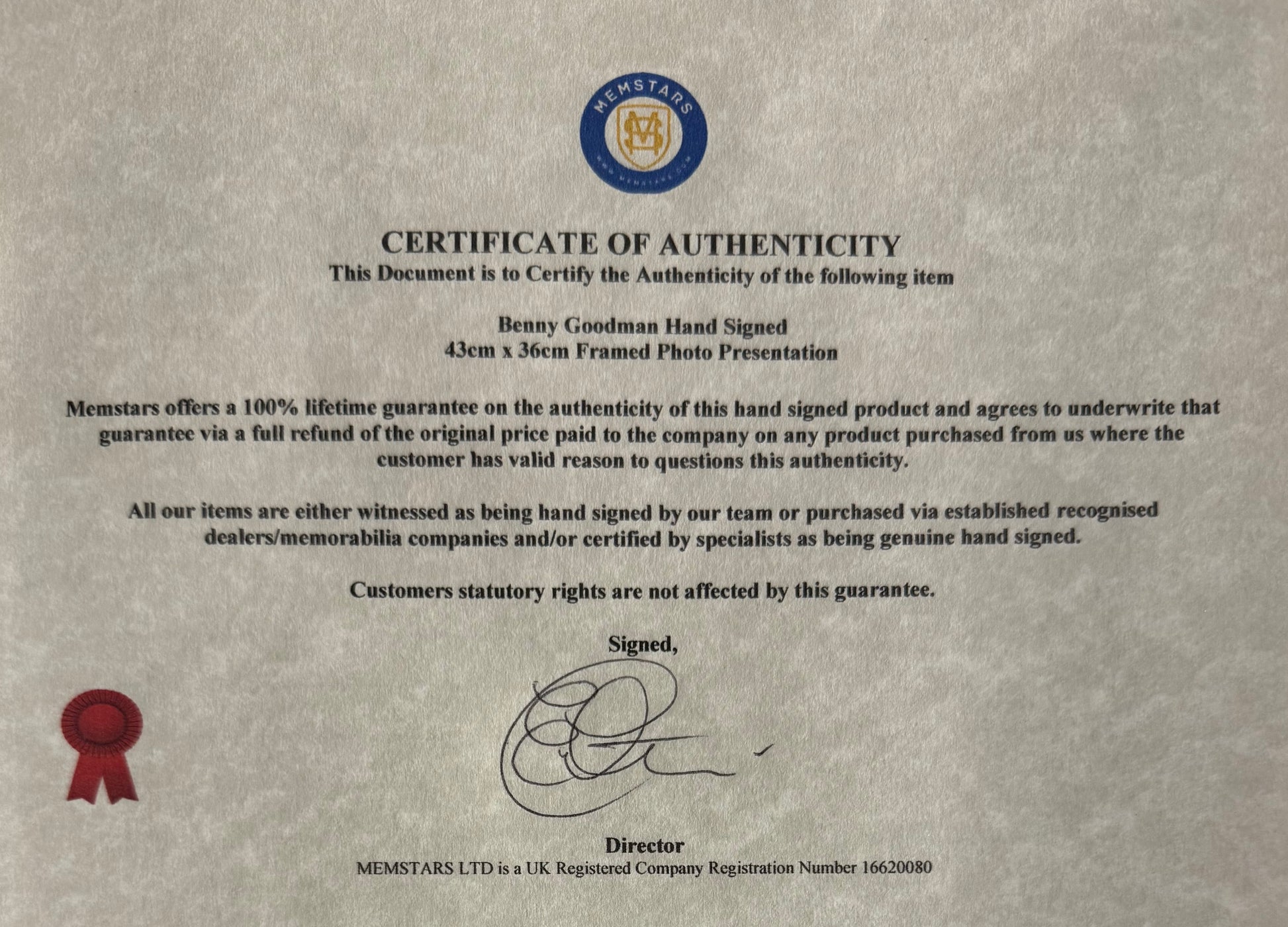 Benny Goodman, ‘King of Swing’ Musician, 100% Guaranteed Stunning Hand Signed Photo - With COA - Certificate of Authenticity. Framed 43cm x 36cm.