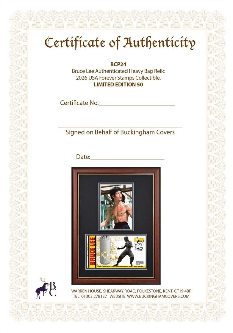 Own a piece of martial arts history with this limited-edition commemorative Bruce Lee collectible featuring a genuine, encapsulated fragment of Bruce Lee's heavily used Jeet Kune Do training heavy bag. Include 2026, USA Forever Bruce Lee stamp and special cachet.