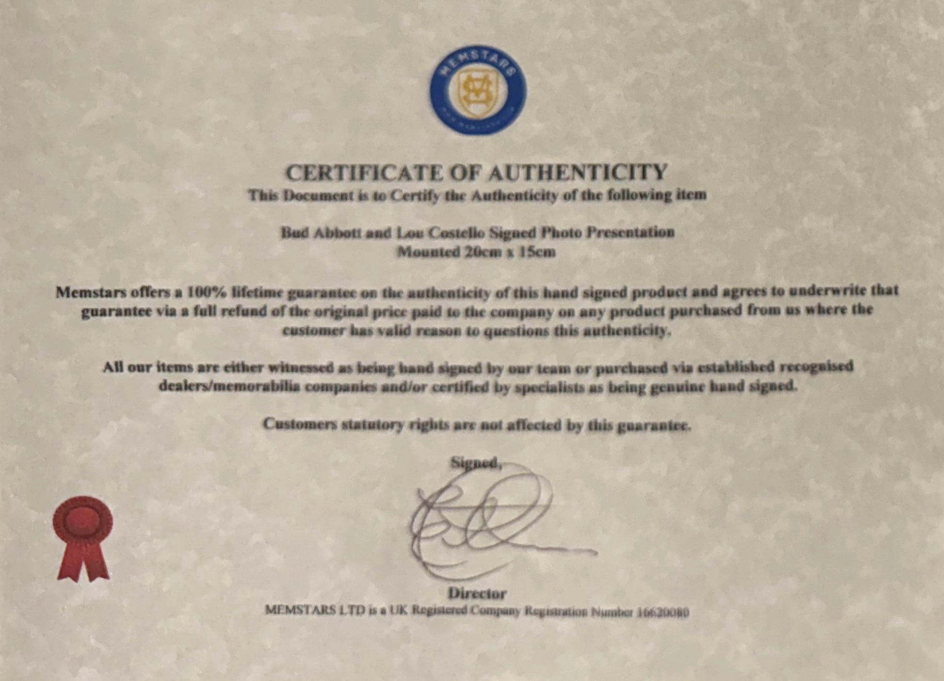 We only sell 100% genuine HAND SIGNED authentic memorabilia with Certificates of Authenticity Guaranteed by us and/or AFTAL Members.