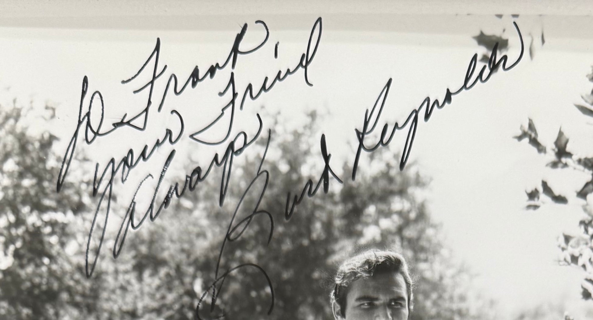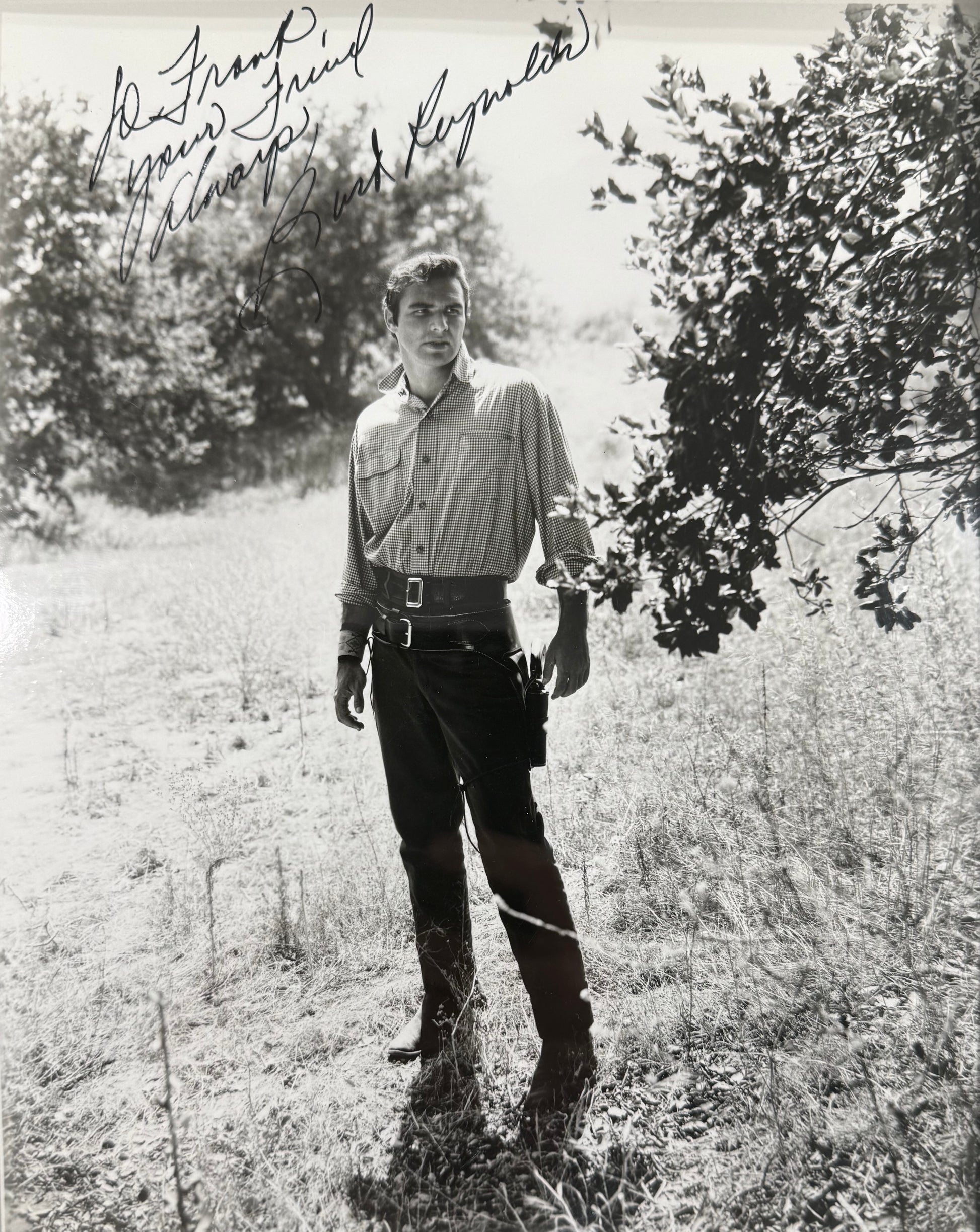 A Burt Reynolds 100% hand signed portrait photo, dedicated to 'Frank'.