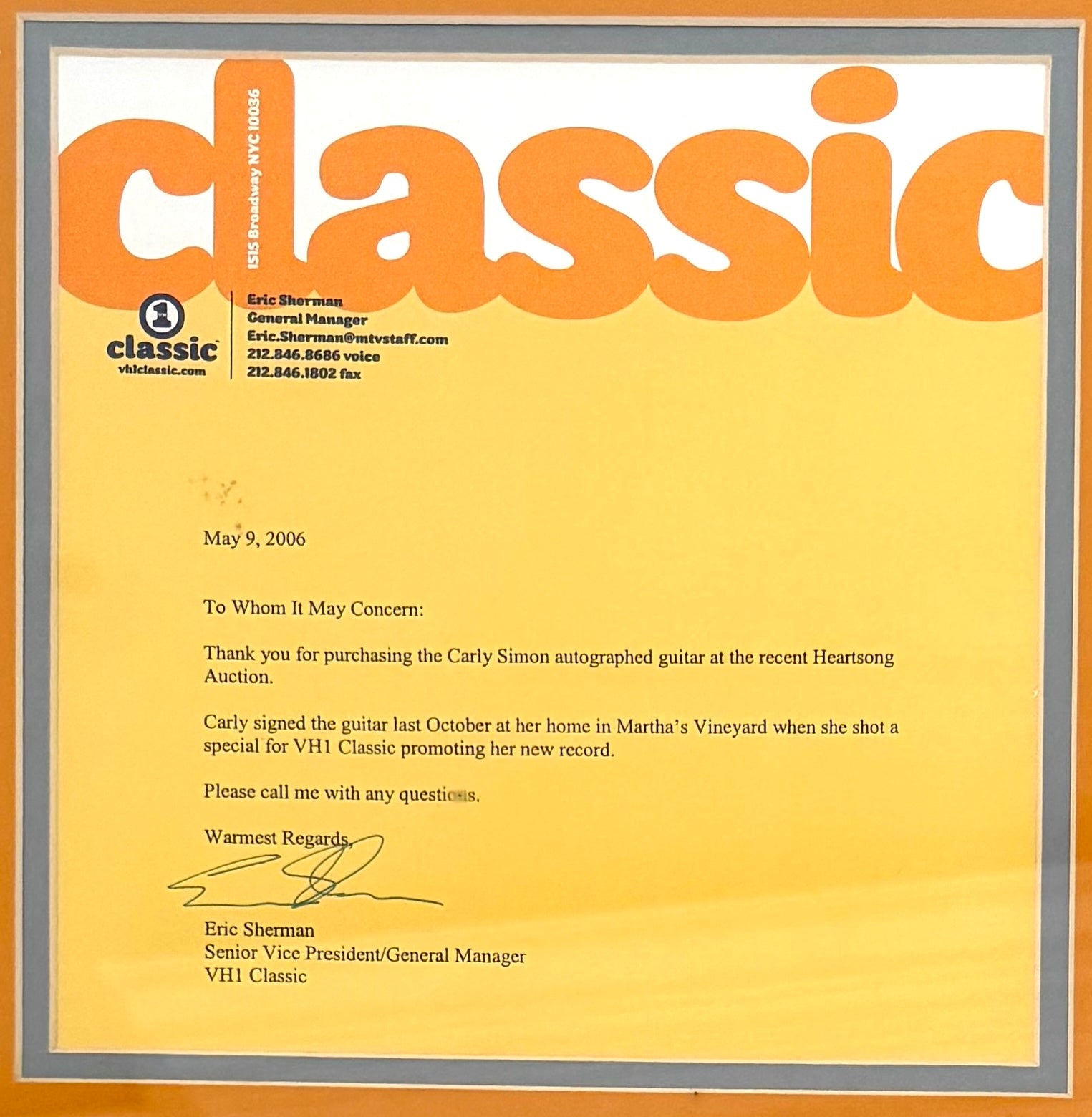 Carly Simon - A signed guitar, sold together with a signed letter from Eric Sherman Senior Vice President of VH1, the signature was acquired in 2006 in person when Carly Simon was promoting her new record with VH1.