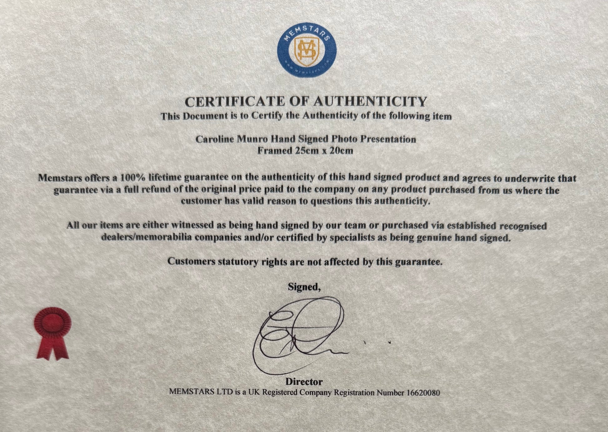A Guaranteed 100% hand signed Caroline Munro photo.