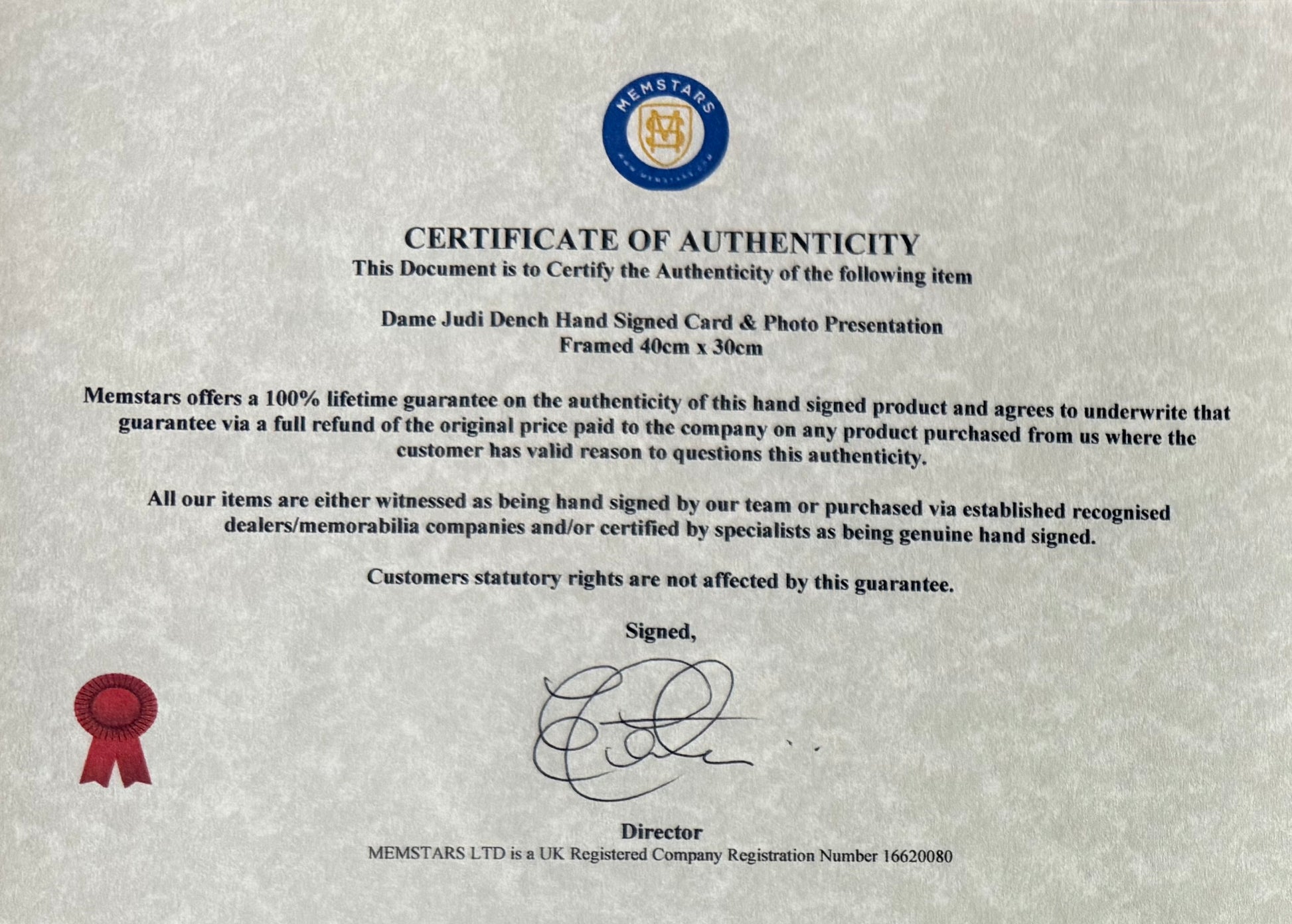 A Guaranteed 100% hand signed Dame Judi Dench card with photo presentation.