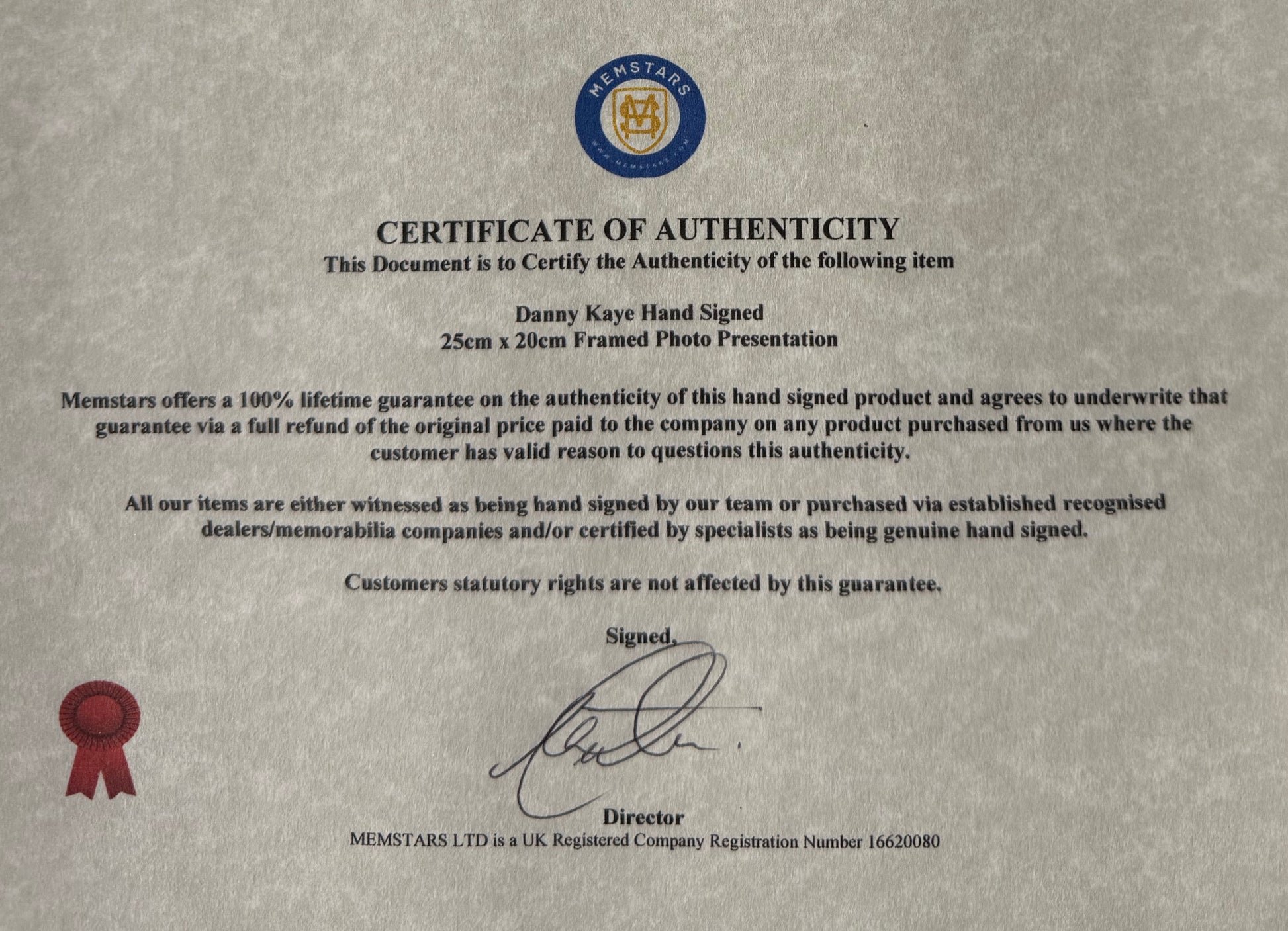 Danny Kaye - Musician, Singer, Actor, Dancer, Comedian 100% Guaranteed Stunning Hand Signed Photo - With COA - Certificate of Authenticity. Framed 25cm x 20cm.
