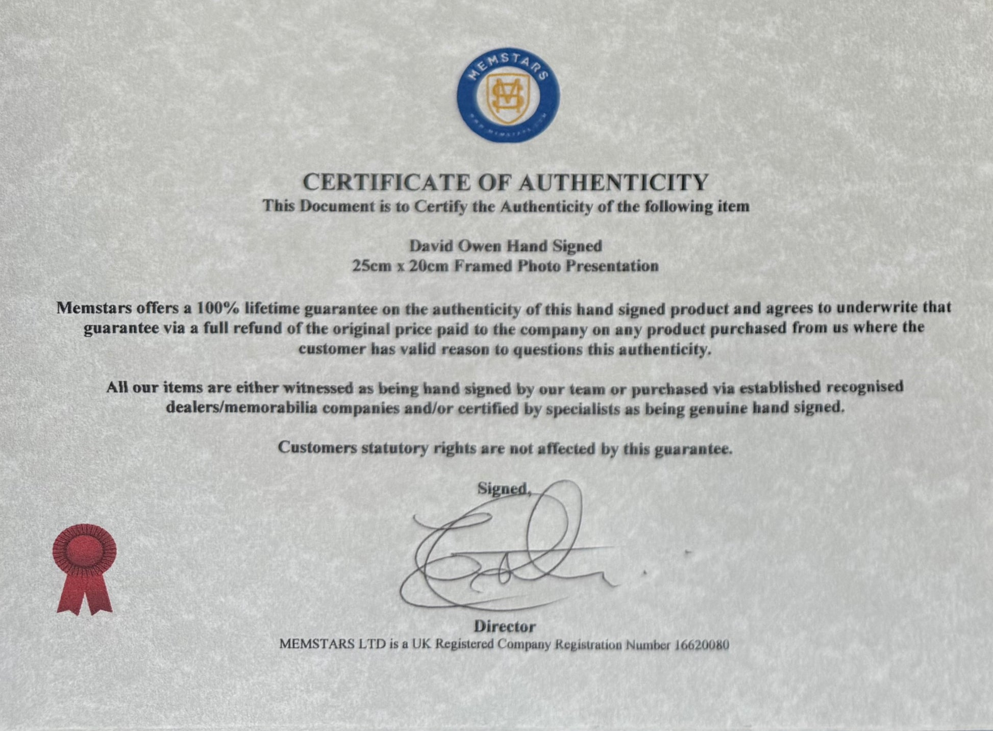 100% RARE Stunning Genuine 100% Guaranteed Hand Signed David Owen Photo - With COA - Certificate of Authenticity.