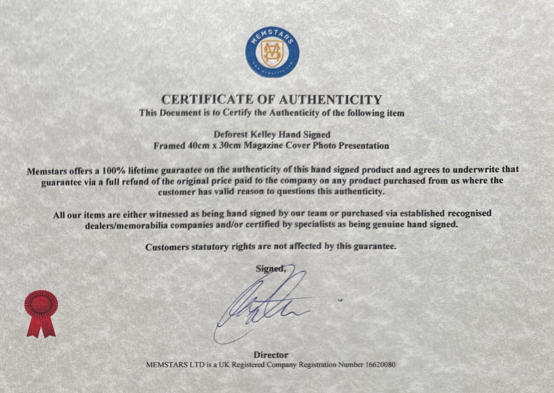 This incredible rare piece of 100% genuine hand signed memorabilia would make the most amazing gift/present for any DeForest Kelley, Star Trek fan, or grace any room in the house or office.