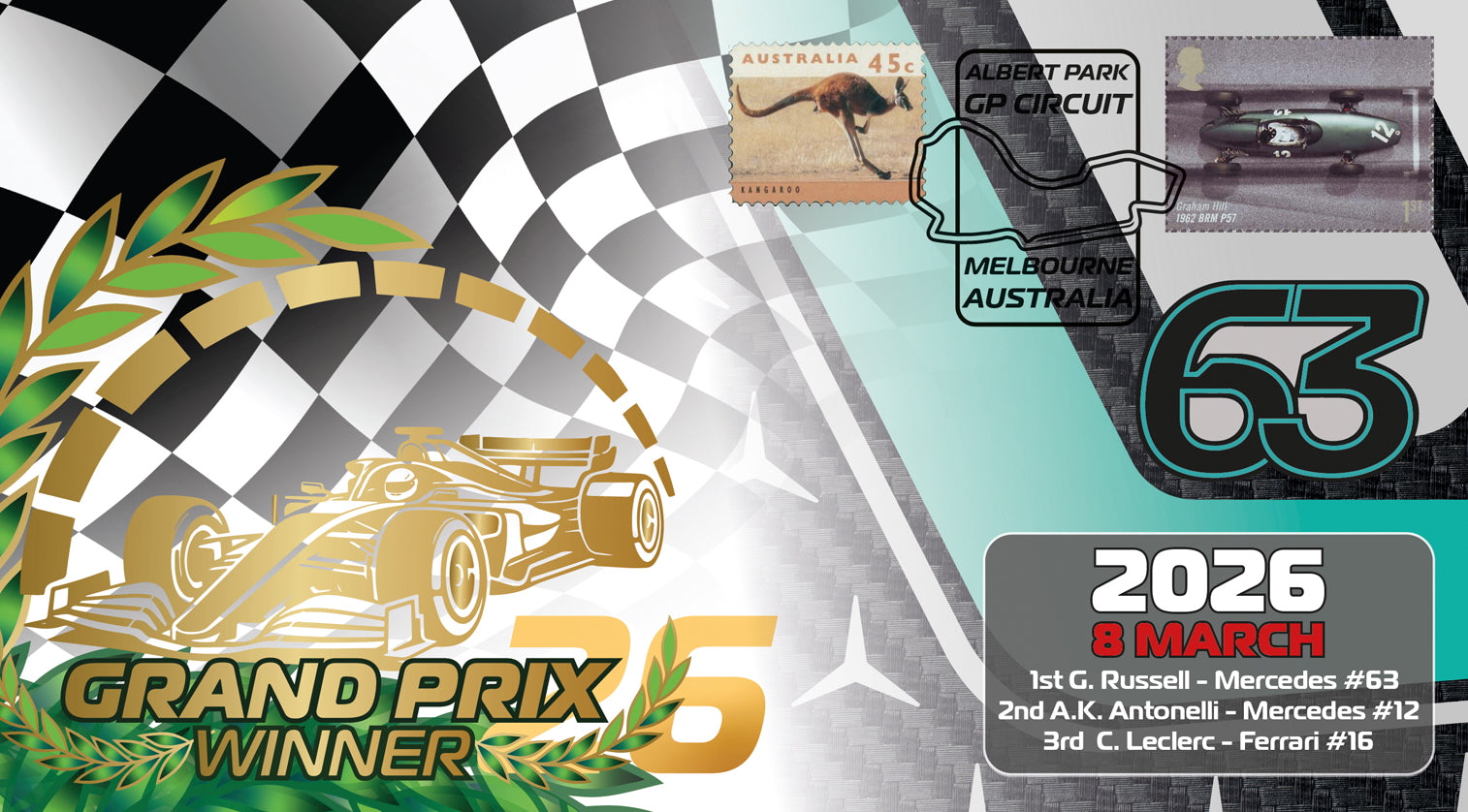 - The design features a dramatic gold-foiled F1 car bursting through a chequered flag background. 1995 Australian 45c Kangaroo stamp (nodding to the host nation), and a classic Graham Hill 1962 BRM P57 stamp (1st class) tying back to Melbourne’s rich Grand Prix heritage. Special Albert Park, Melbourne pictorial circuit layout ink stamp.