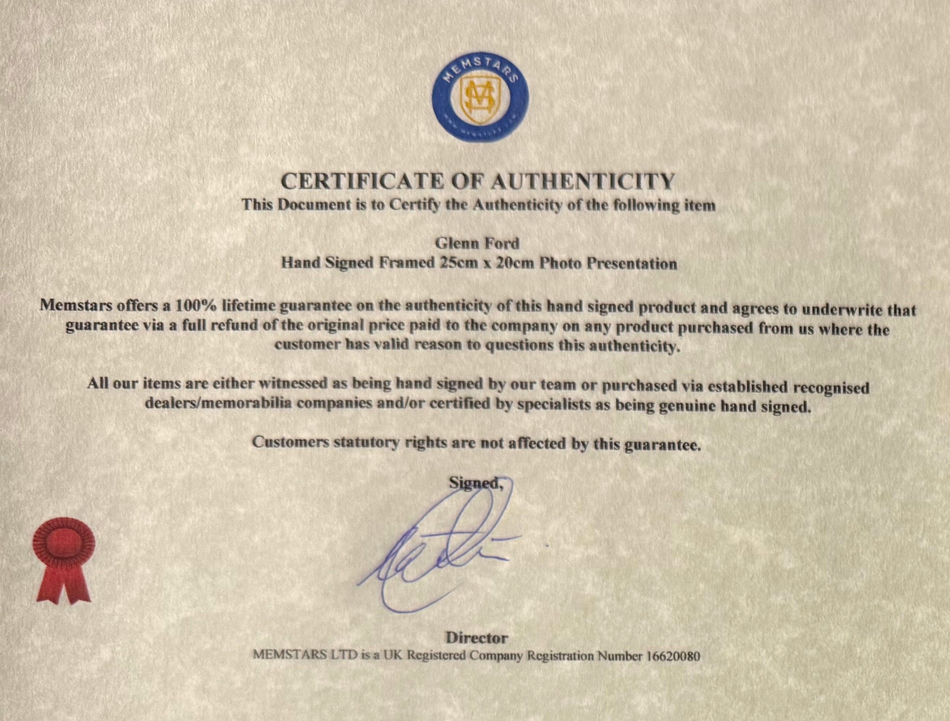 Glenn Ford - 100% Original Genuine Hand Signed Framed (10’ inch x 8’ inch) Rare Original Publicity Photo - With Certificate of Authenticity (COA);