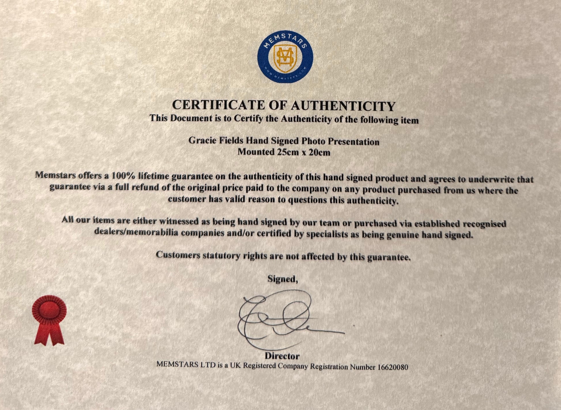 Gracie Fields, 100% RARE Stunning Genuine 100% Guaranteed Hand Signed Original Photo - With COA - Certificate of Authenticity. Framed 25cm x 20cm.