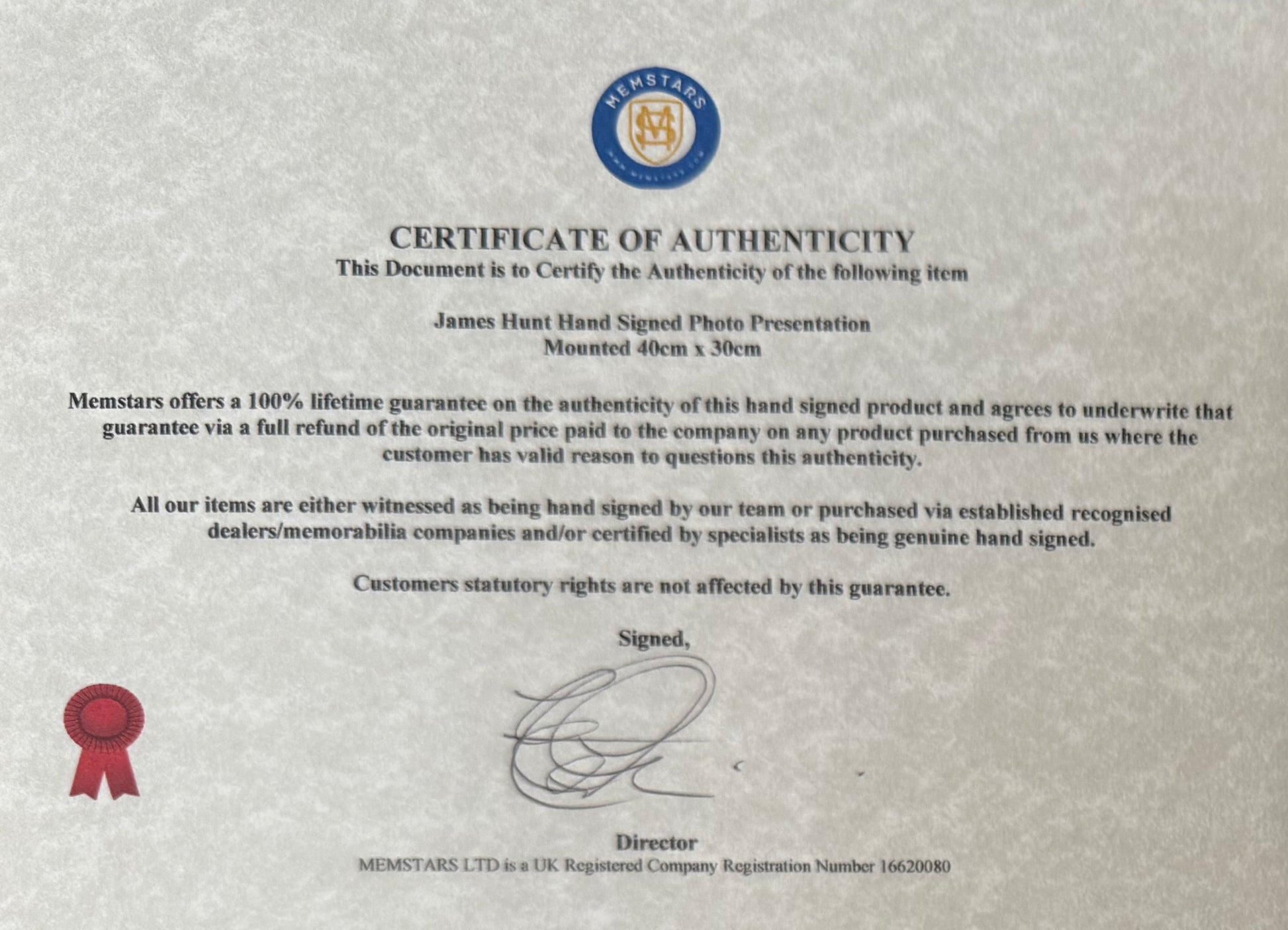 James Hunt, F1 McLaren World Champion Legend, Hand Signed Photo & COA