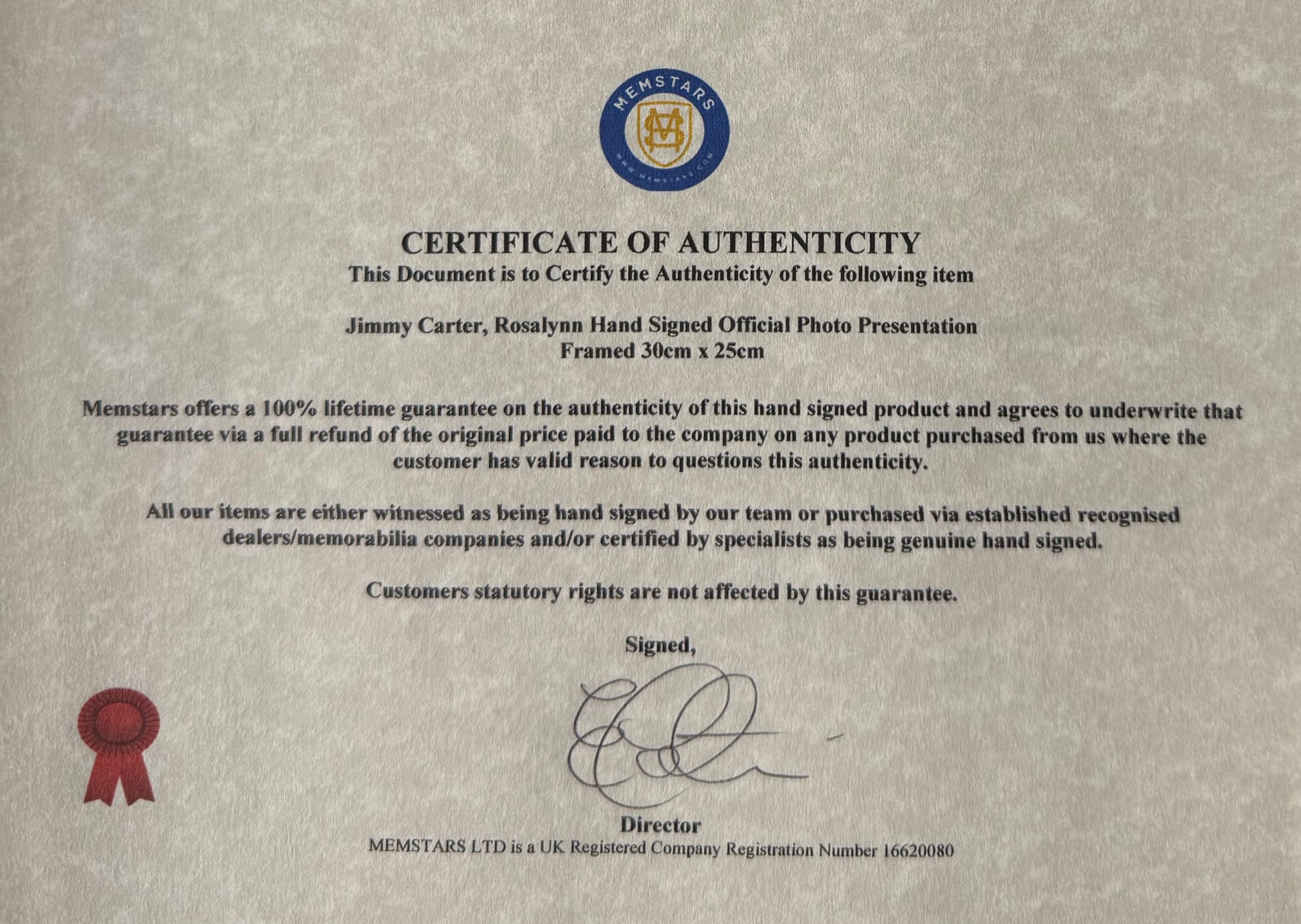 We ONLY sell 100% Guaranteed Hand Signed products certified and underwritten by us and/or registered memorabilia dealers.