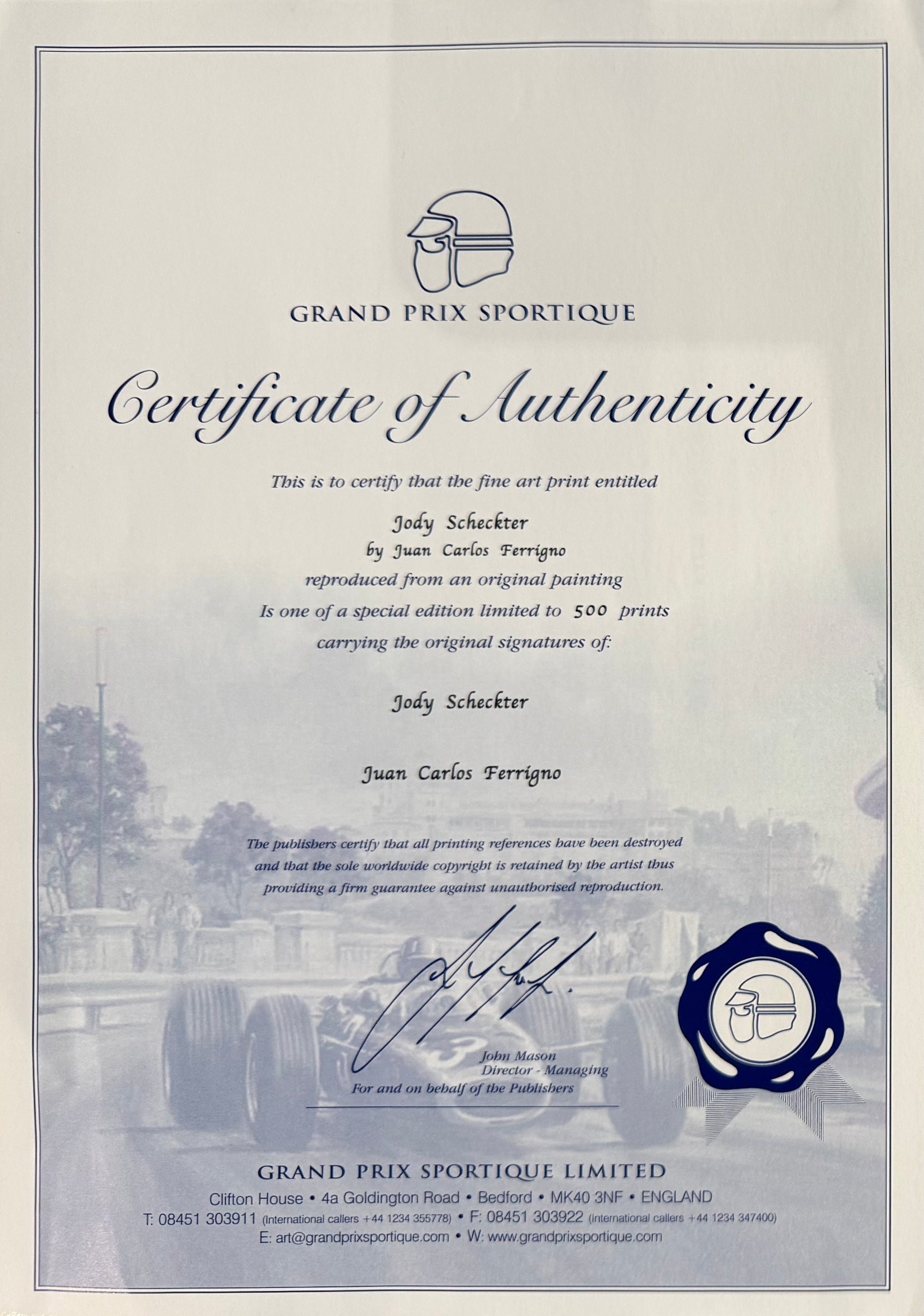 Jody Scheckter, Ferrari Formula 1 Legend, Guaranteed Hand Signed Limited Edition (360/500) Juan Ferrigno Print (75cm x 50cm) with COA (Certificate of Authenticity).
