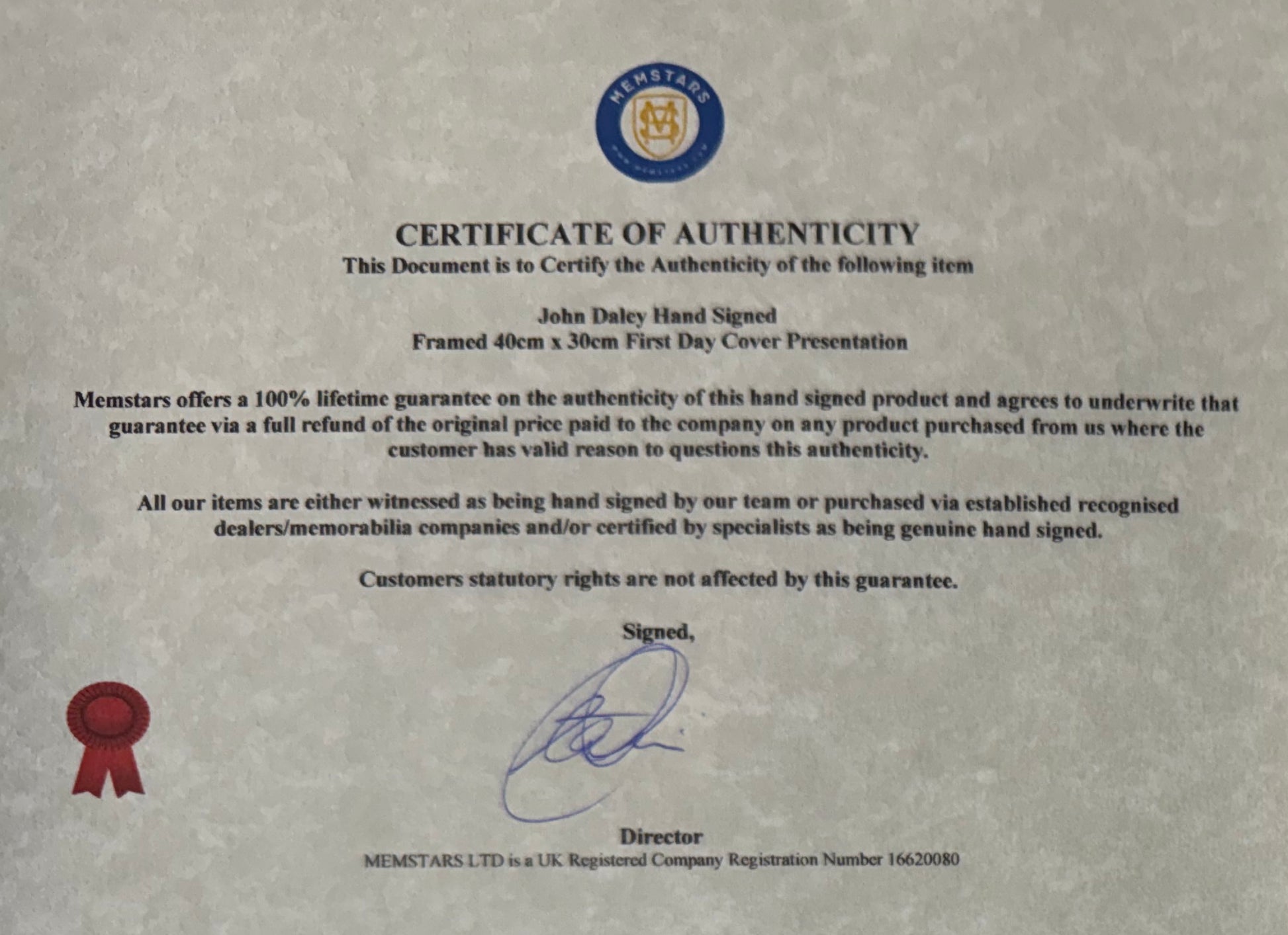We only sell 100% genuine HAND SIGNED authentic memorabilia with Certificates of Authenticity underwritten by us.