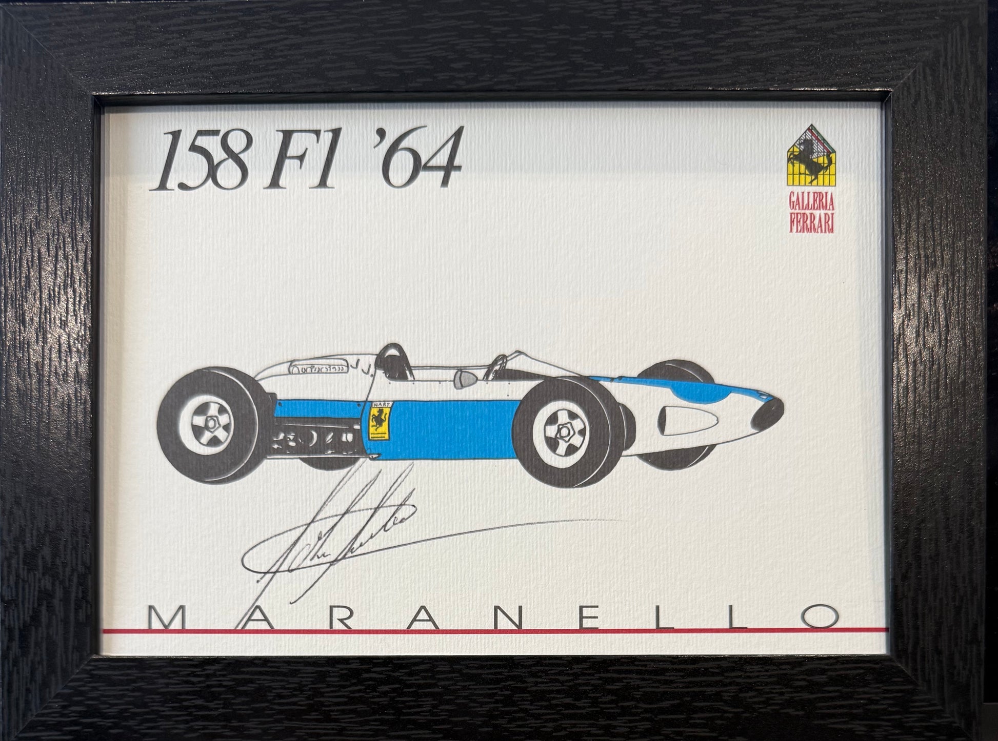 John Surtees Stunning Hand Signed Limited Edition Official Ferrari 158 '64 Formula 1 Postcard (Framed 15cm x 10cm) Complete With COA, Certificate of Authenticity.