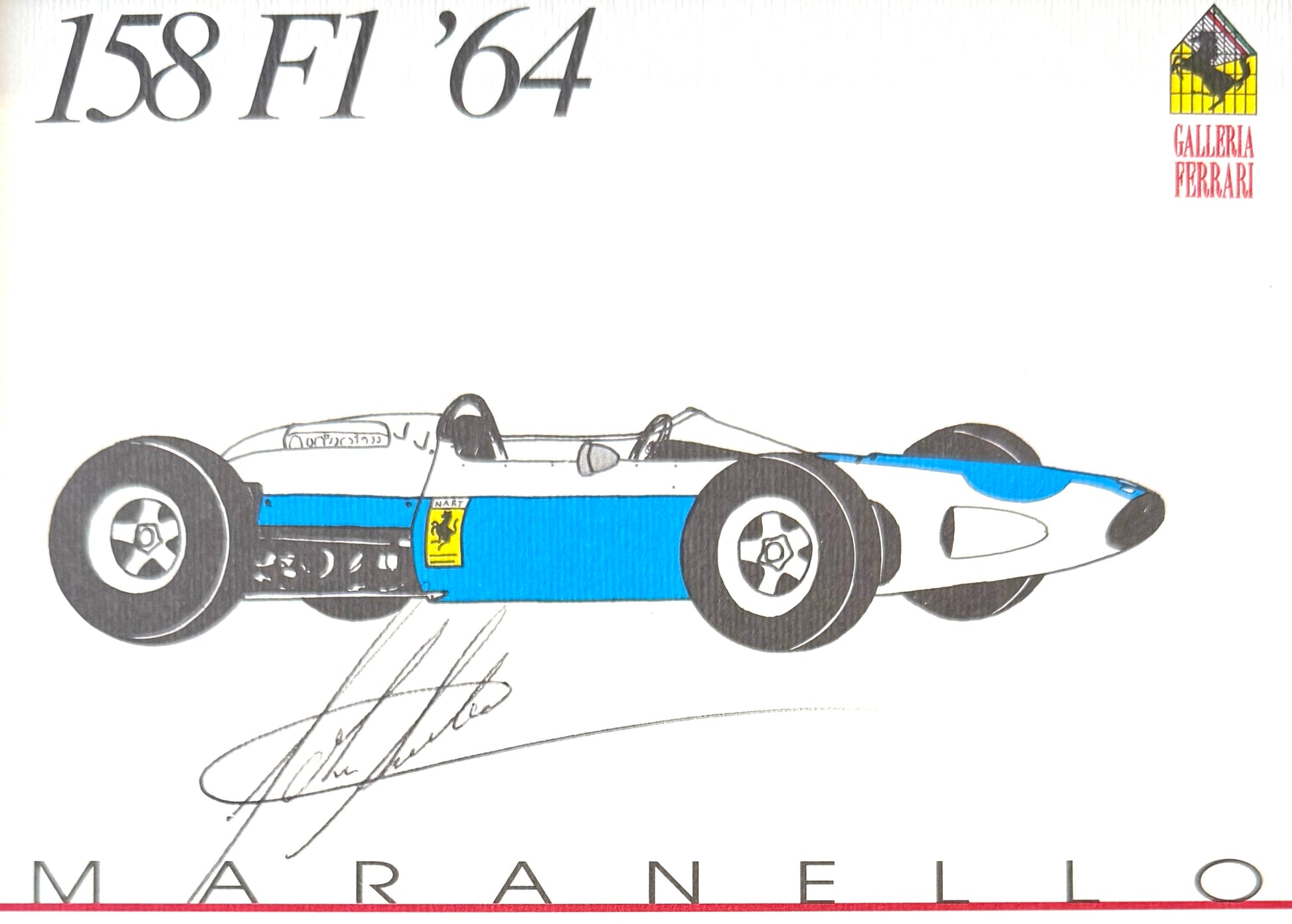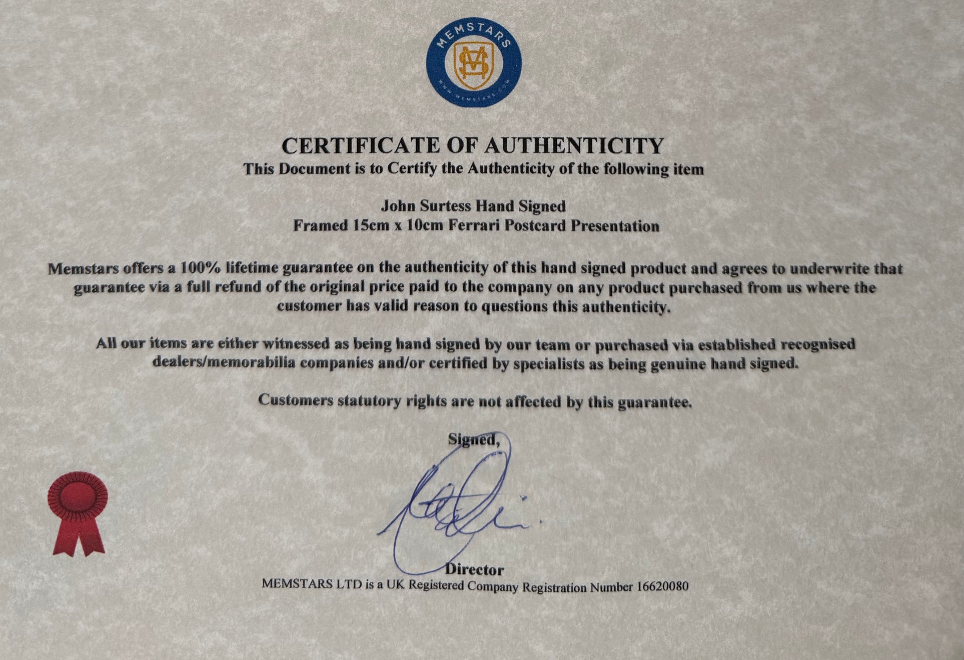 John Surtees, F1, Motorcycle, Ferrari Legend, Hand Signed Official Ferrari Postcard & COA