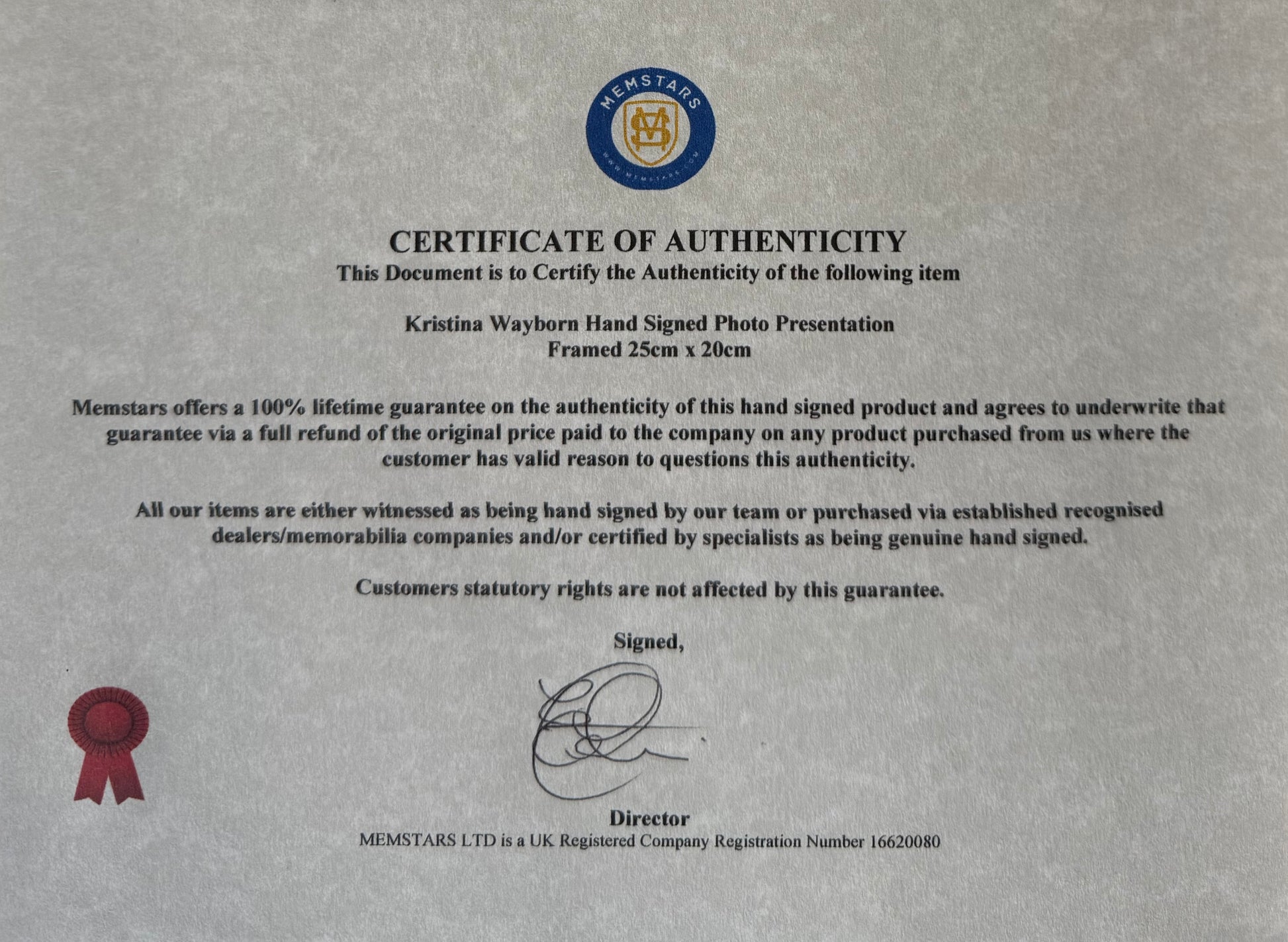 Kristina Wayborn - Stunning Genuine 100% Guaranteed Hand Signed ‘Octopussy’ Photo - With COA - Certificate of Authenticity. Framed 10' inch x 8' inch. A Guaranteed 100% hand signed Kristina Wayborn photo. Britt-Inger Johansson (born 24 September 1950), known professionally as Kristina Wayborn, is a Swedish actress and beauty pageant titleholder who worked mostly in the United Kingdom and the United States. She was cast in probably her best-known role as Magda in Octopussy (1983) which features a memorable scene in which Magda beats up several of villain Kamal Khan's guards, showing a surprising agility and acumen for martial arts. During filming of this scene, an accident occurred and Wayborn suffered several broken toes. We only sell 100% genuine HAND SIGNED authentic memorabilia with Certificate's of Authenticity. This would make an amazing gift or grace any room in the house or office. A collectible asset that can also be enjoyed by any Kristina Wayborn, film fan, or general collector. Buy with Complete and Total Confidence from the UK's largest poster/memorabilia seller and also being eBays highest rated seller in this category with over 111,000 satisfied customers at an almost 100% positive feedback rating!