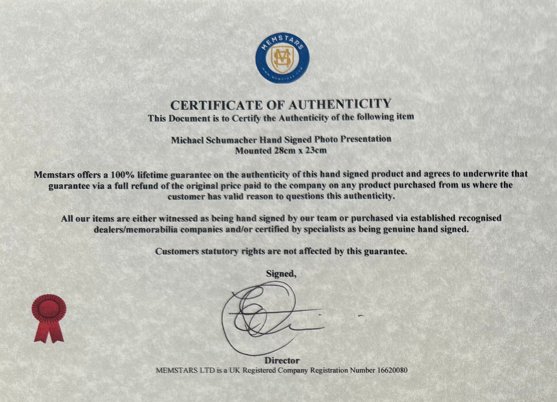 Michael Schumacher, F1 Legend, Hand Signed Framed Photo-Card Presentation With COA