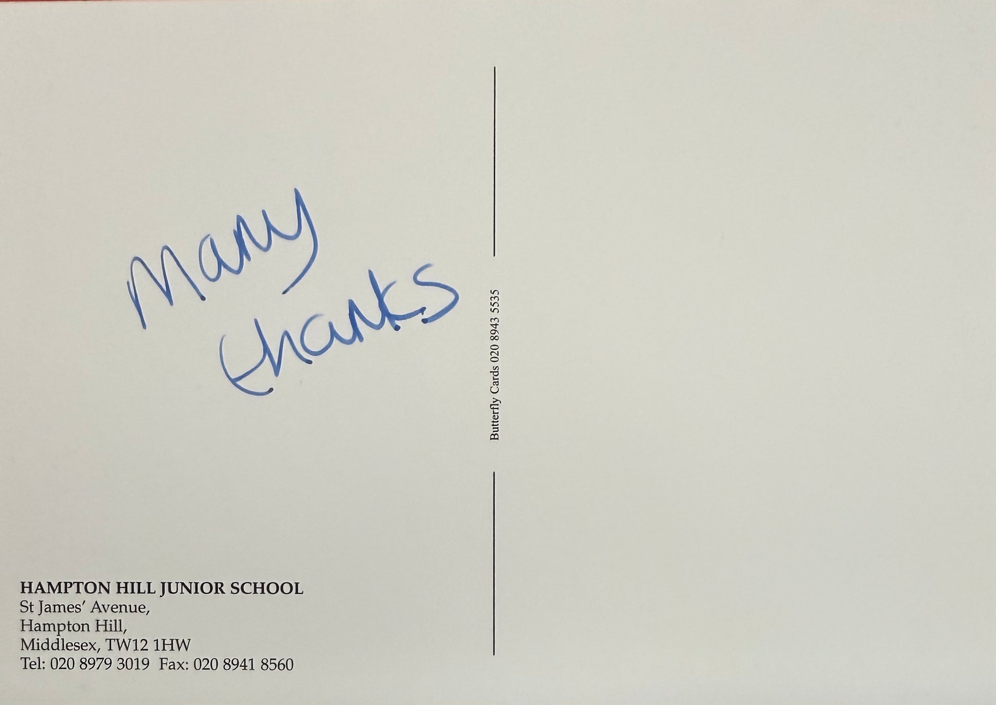 This item was purchased at a fundraising event for Hampton Hill Junior School and a postcard with the words ‘Many Thanks’ inscribed on the back.