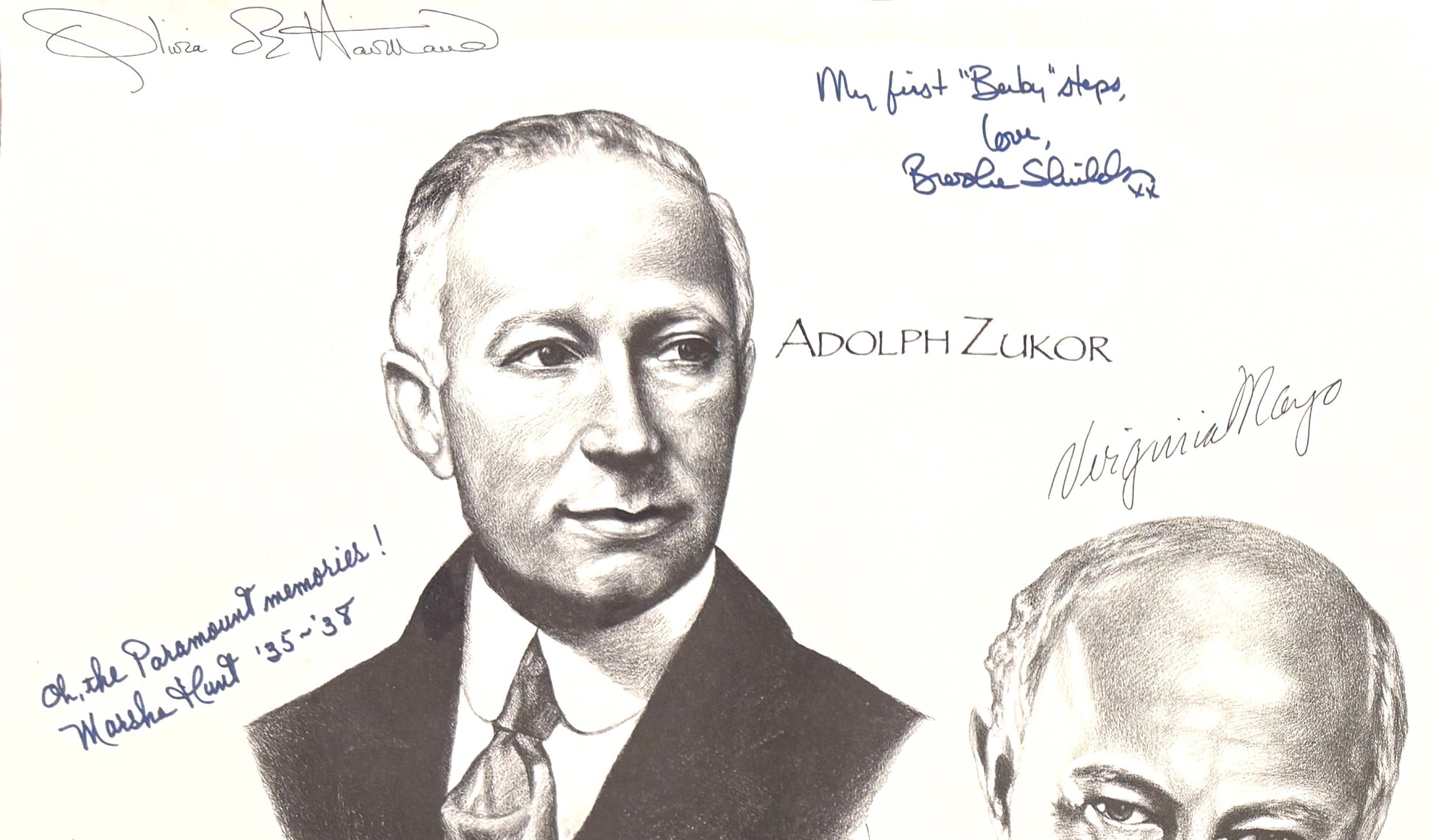Hand signed by 12 stars who attended this historic grand opening event: Brooke Shields, Olivia De Havilland, Virginia Mayo, Marsha Hunt, Janet Leigh, Buddy Ebsen, Charles "Buddy" Rogers, Caesar Romero, Anthony Quinn, George Burns, Douglas Fairbanks Jr. and Shirley MacLaine.