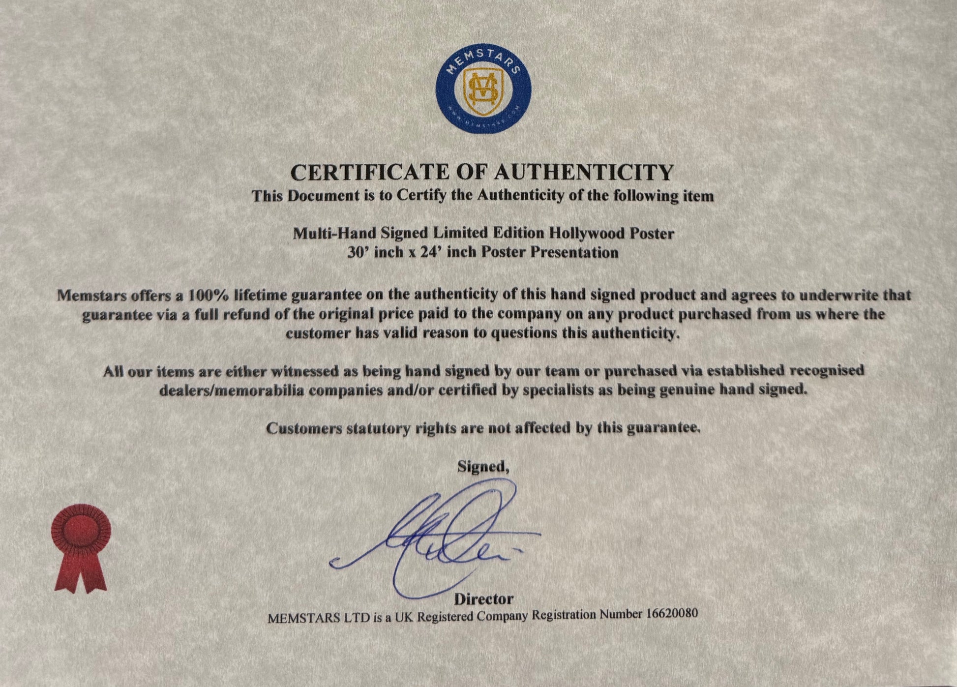 We only sell 100% genuine HAND SIGNED authentic memorabilia with Certificates of Authenticity underwritten by us.