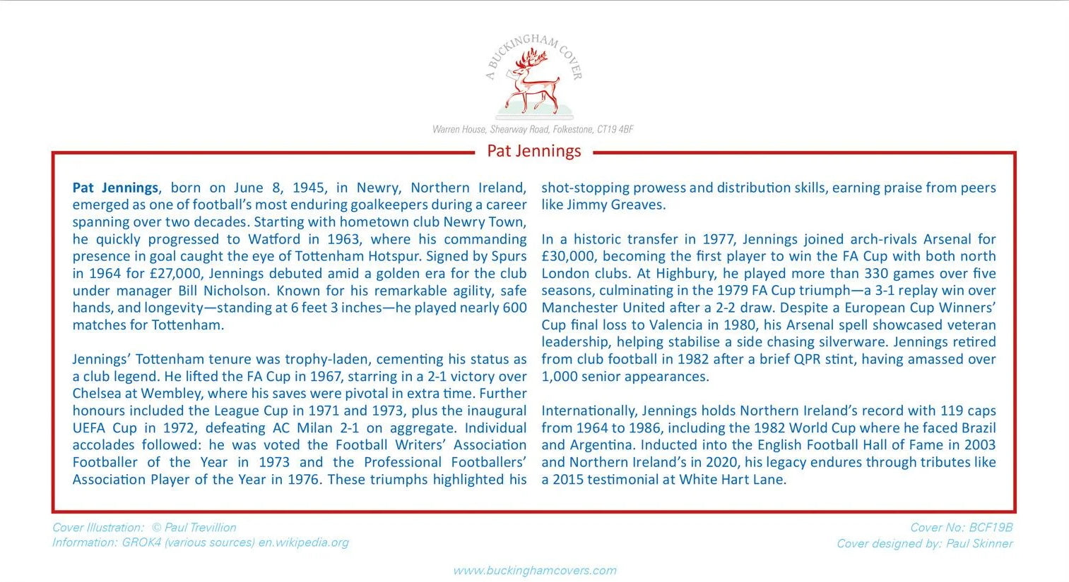 Limited Edition of just 125 Worldwide, the collectable honours Northern Ireland's towering goalkeeper who made over 1,000 appearances for club and country! The keeper won the famous trophy for both North London clubs and is one of very few players to still be adored by the rival clubs.