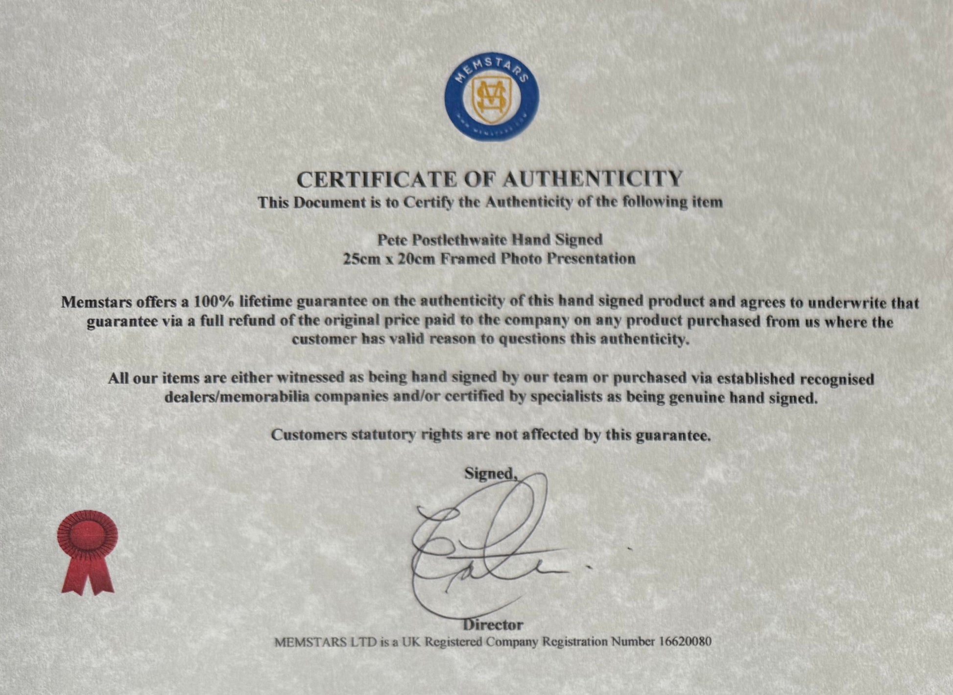 A Guaranteed 100% hand signed Pete Postlethwaite Card Presentation.