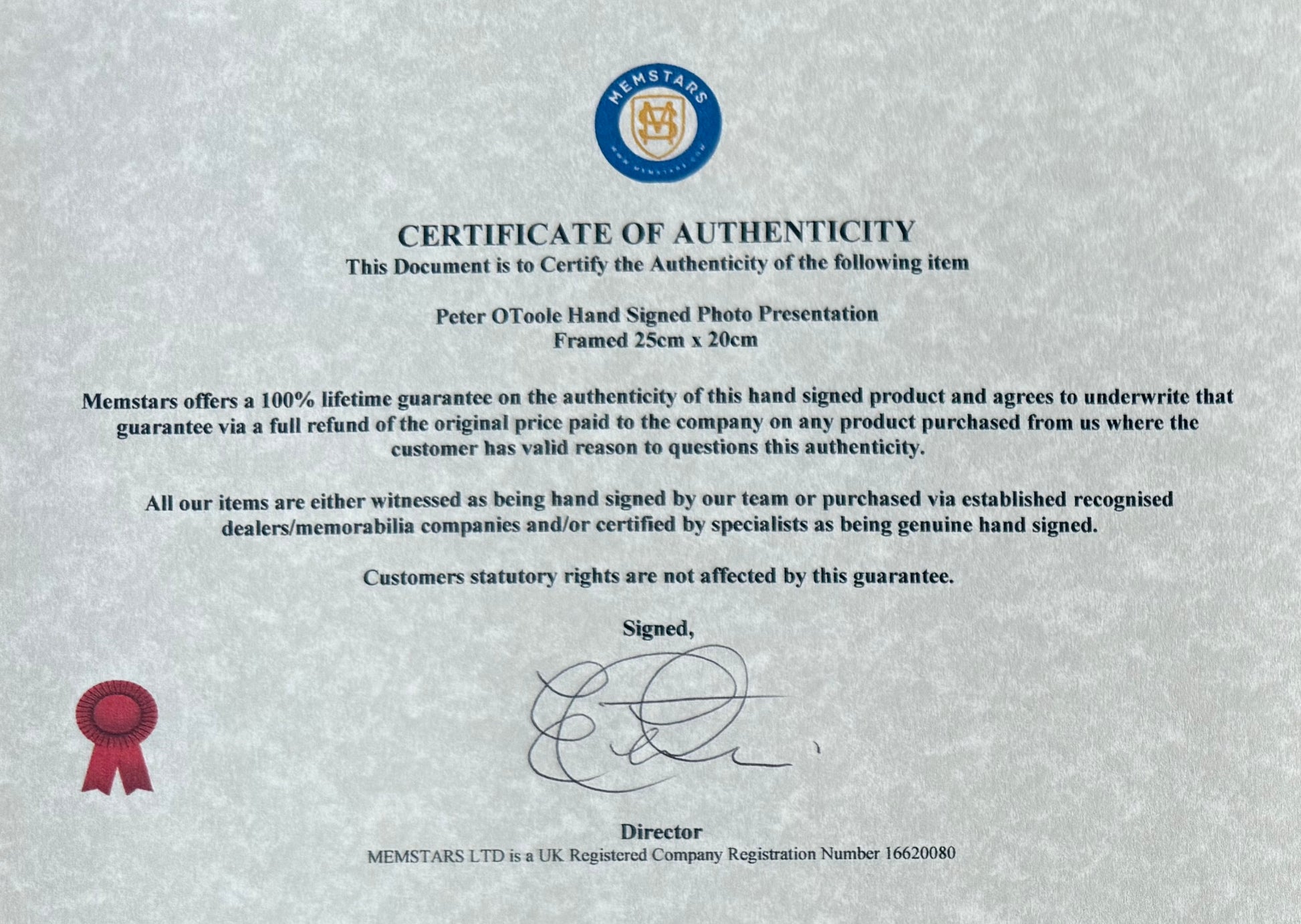 100% RARE Stunning Genuine 100% Guaranteed Hand Signed Peter O'Toole Photo - With COA - Certificate of Authenticity. Framed, 25cm x 20cm.