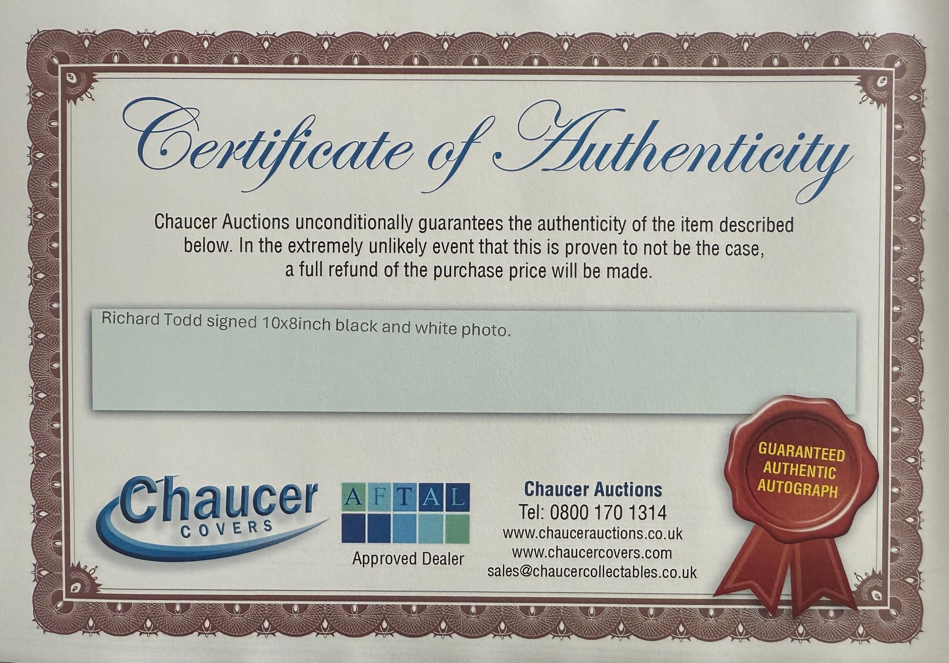 A Guaranteed 100% hand signed Richard Todd Photo.