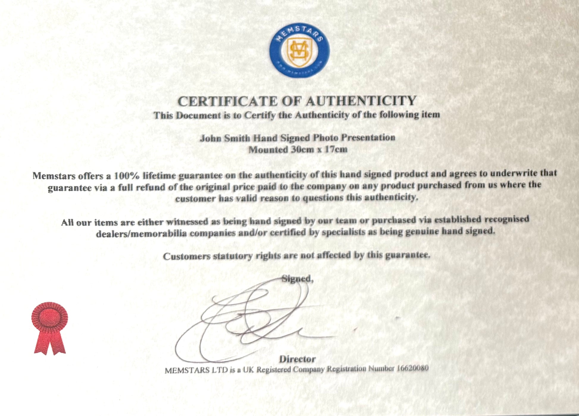 We only sell 100% genuine HAND SIGNED authentic memorabilia with Certificates of Authenticity from us and/or AFTAL members.