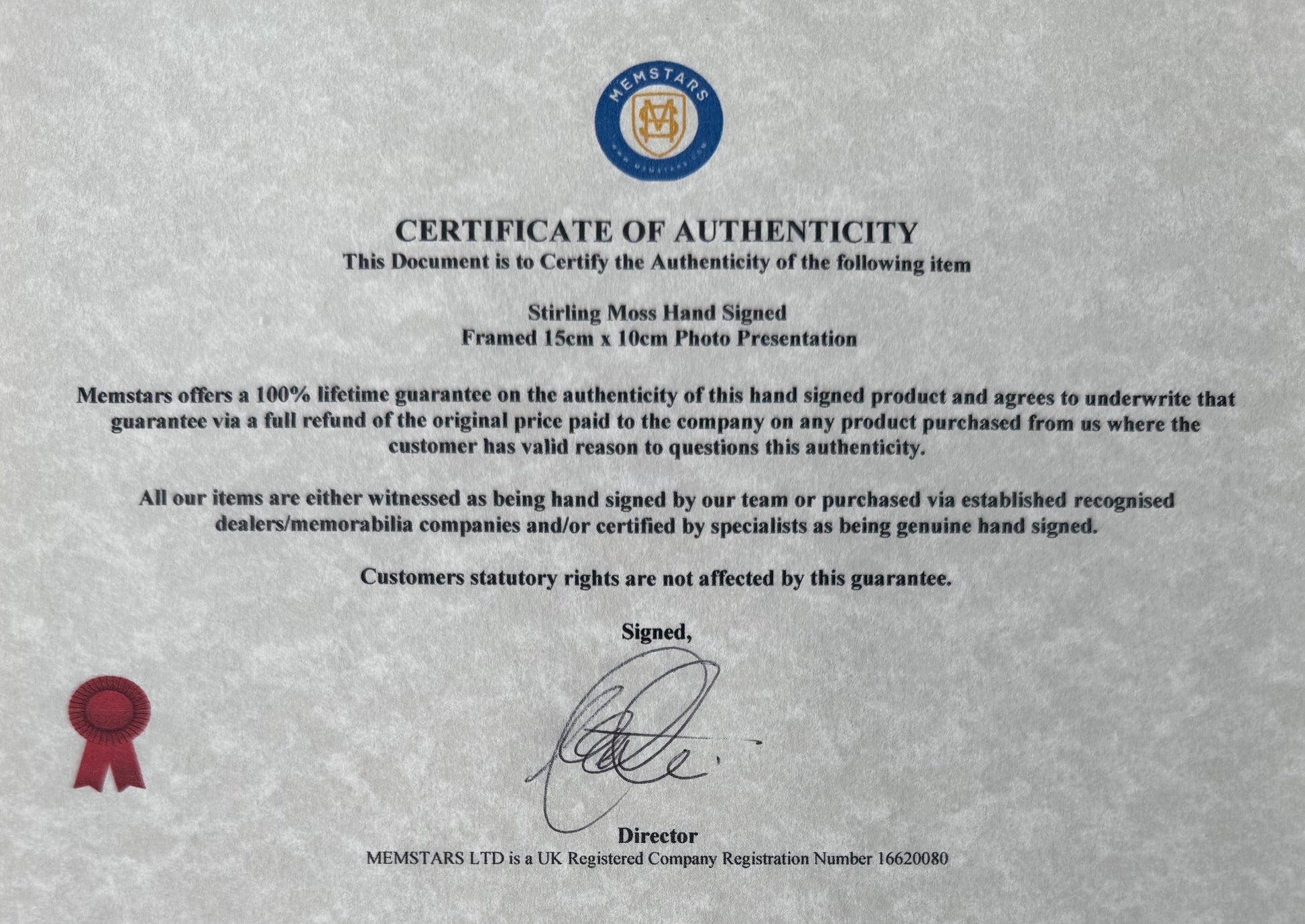 Super Rare Stirling Moss Framed (15cm x 10cm) 100% Guaranteed Hand Signed Photo & COA.