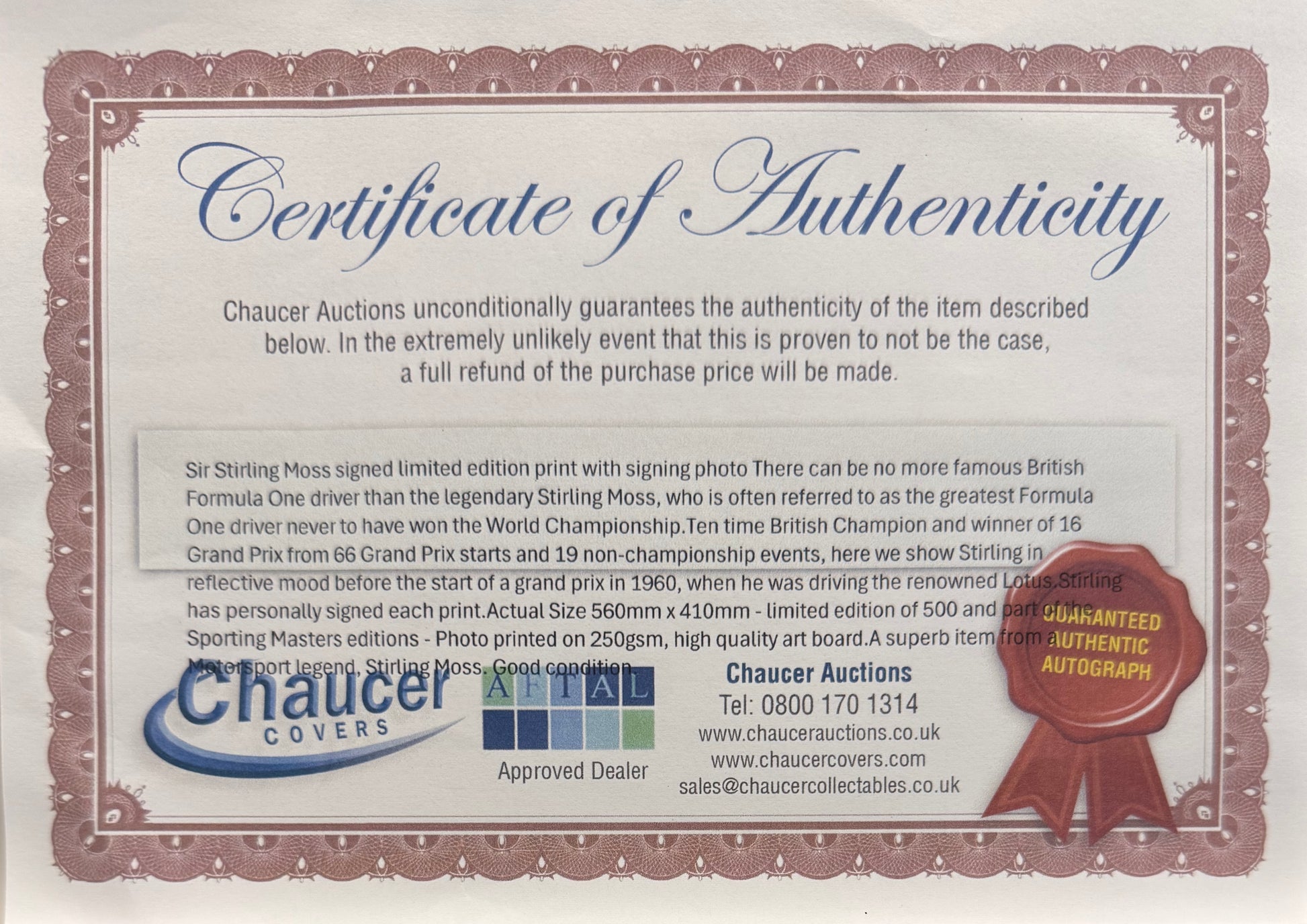 Sir Stirling Moss Hand Signed Limited Edition Print (51/500) With AFTAL COA