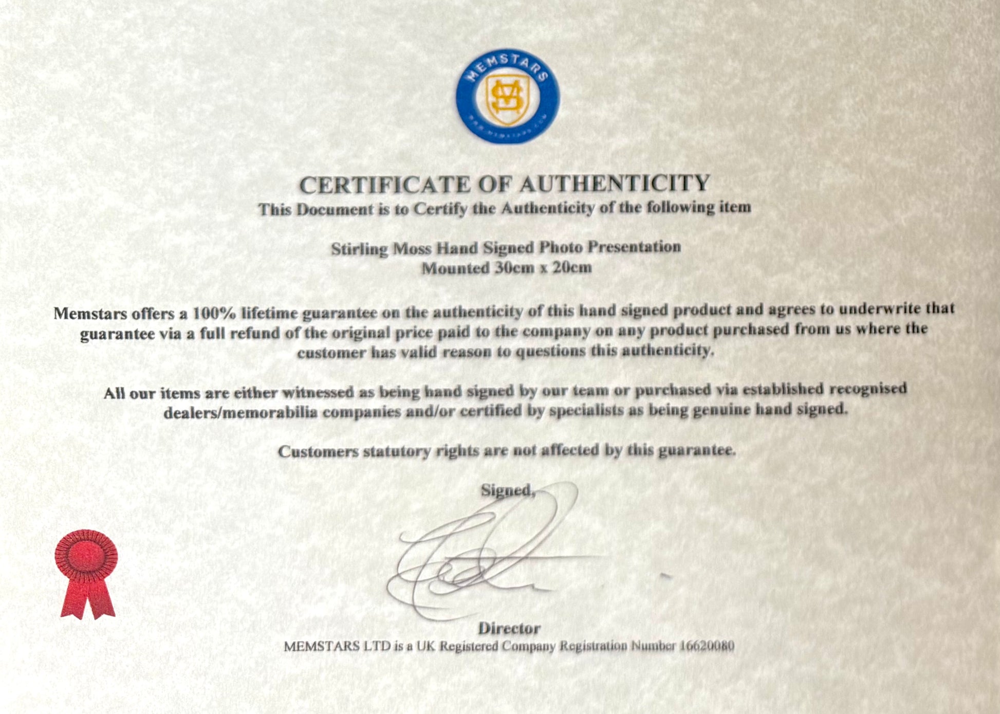 Framed (30cm x 20cm) Super Rare Stirling Moss 100% Guaranteed Hand Signed Original Photo with COA.