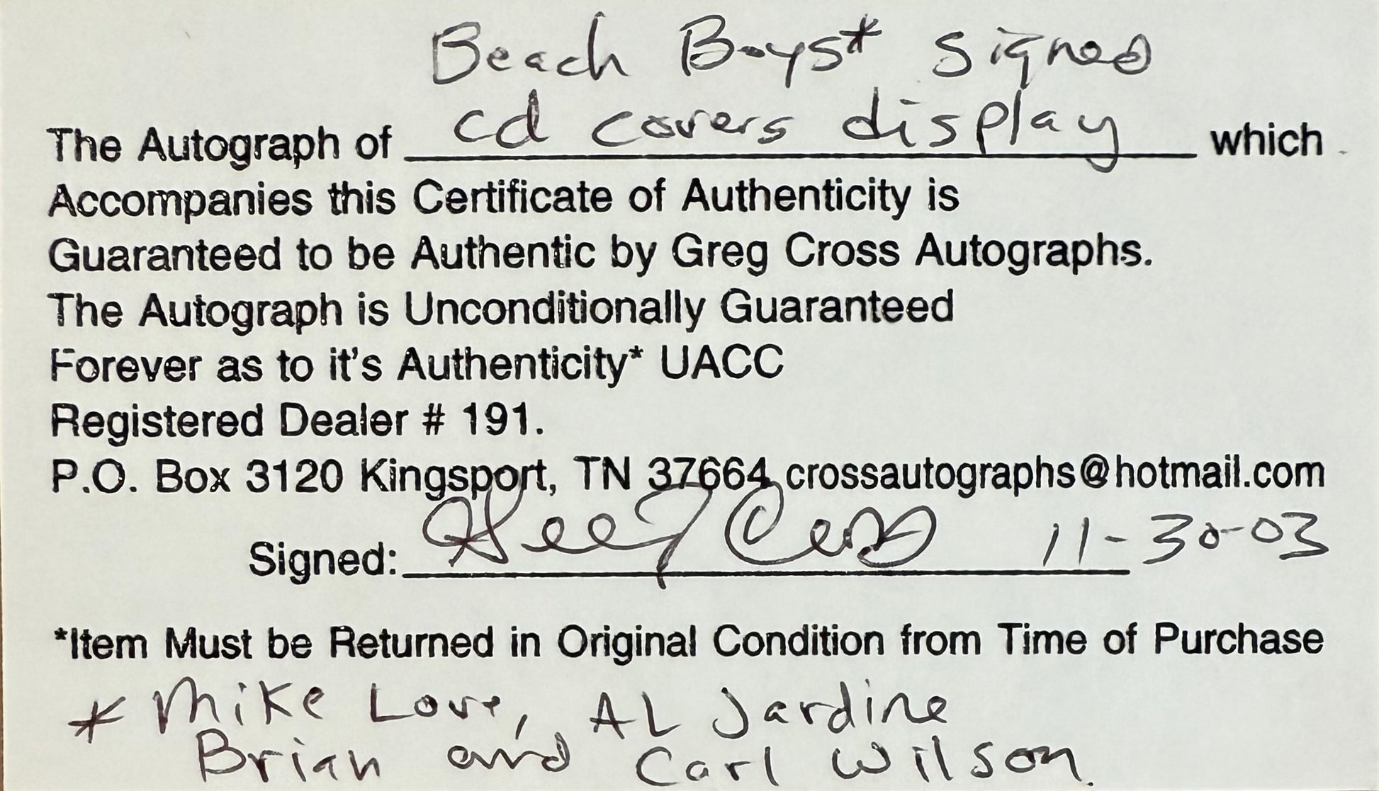 Please note that the autographs of Al Jardine, Mike Love and Carl Wilson are badly faded.