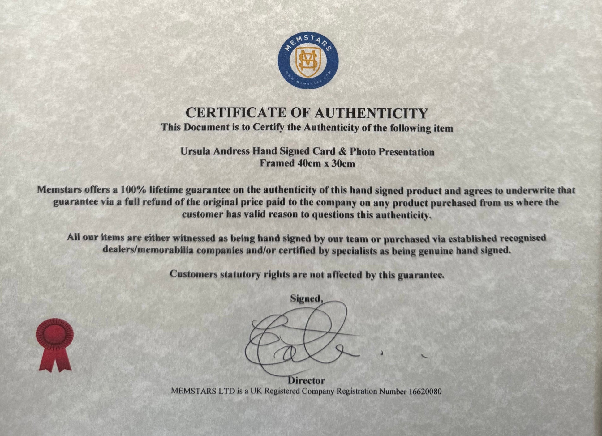 A Guaranteed 100% hand signed Ursula Andress card presentation.