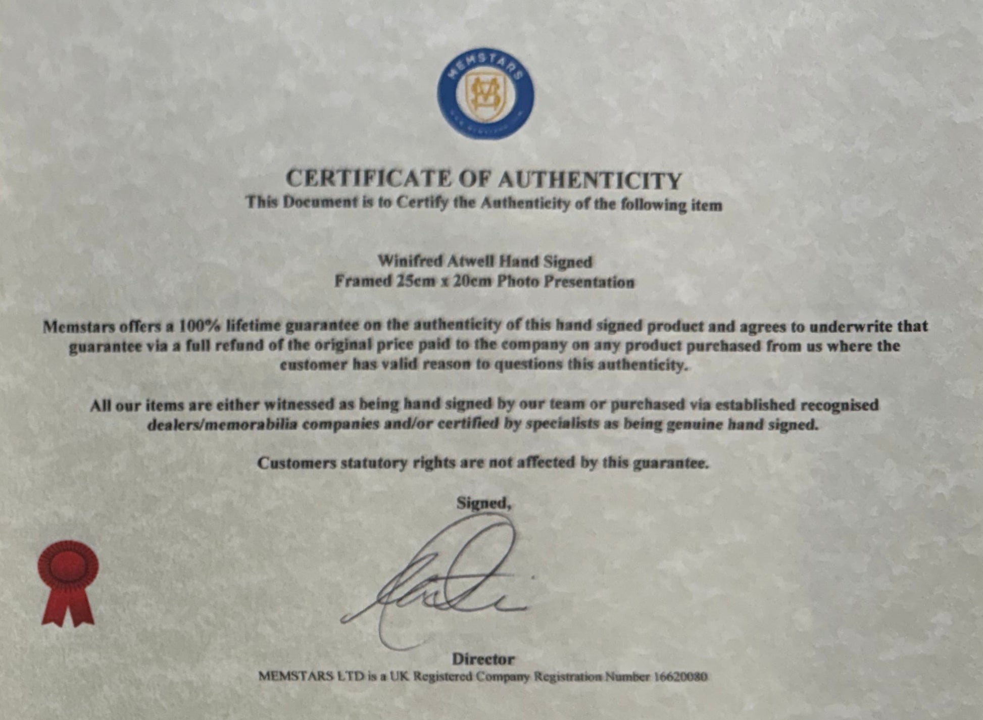 We only sell 100% genuine HAND SIGNED authentic memorabilia with Certificates of Authenticity underwritten by us.